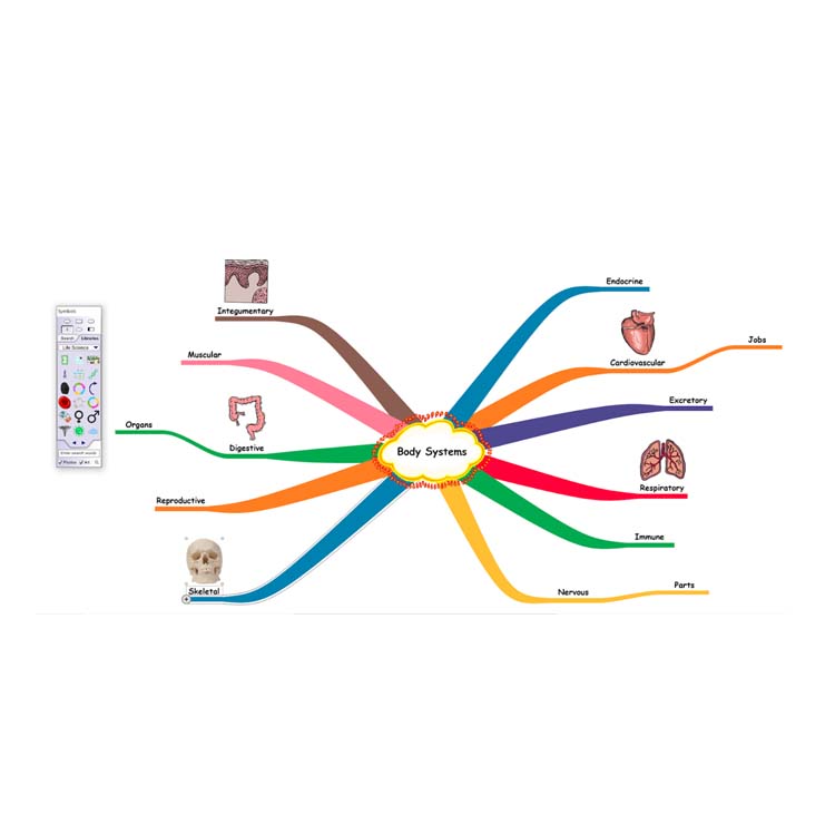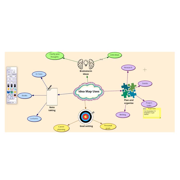 • Symbols – Symbols and images within Inspiration allow users to quickly add visual cues to their diagrams which helps with comprehension and retention. While some old favourites remain, the majority of the symbols library has been updated to provide more updated and engaging graphics.