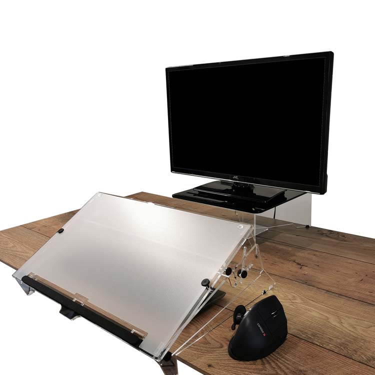The PROWRITER has been specifically designed for people who take notes or write at the workstation. The adjustable PROWRITER sits between the keyboard and the monitor to aid the user as an in-line ergonomic document holder. Simple set the PROWRITER to your chosen angle and when the user wishes to write or take notes, the unit can be easily and quickly pulled over the keyboard (no need to move the keyboard) on the unique and new glide pads to the front of the desk. Unlike other product which force the user to lean forward, the front of the Copywriter Plus is simply positioned to overhang the front edge of the desk and automatically sit on our unique non-slip pads. This innovative process both sets the unit close to the user, and also reduces the need for the user to lean forward to engage the copy. Then simply lift and push back to a copy holder position in seconds!