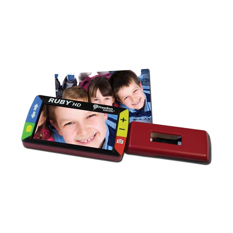 The RUBY HD combines high-definition camera technology with a lightweight body to bring you crystal-clear images in a small package. The 4.3-inch screen and built-in LED lighting provide magnified high-contrast images with no distortion. Its streamlined design means it can slip comfortably into a pocket or purse, giving you easy access to photos, prescription labels, and much more. The RUBY HD is easy to use and has advanced features that can make you even more independent. RUBY HD is offered in traditional red with color buttons.